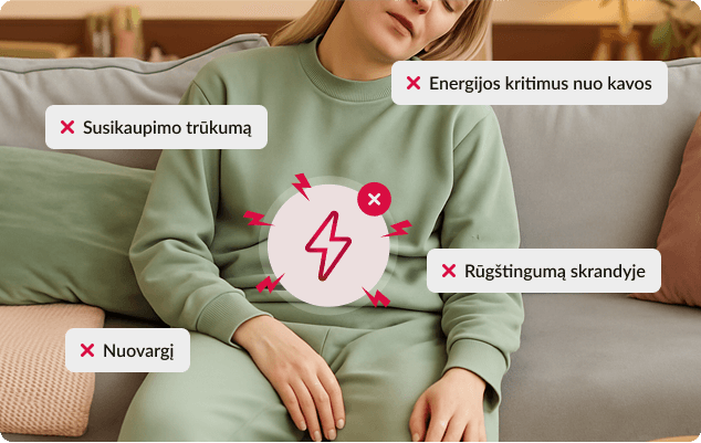 - Staigius energijos pakilimus ir kritimus nuo kavos